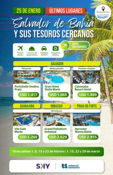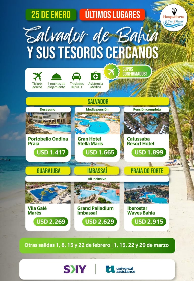 🛎️ Alojamiento + ✈️ tickets aéreos + 🚐 traslados + 🩺 asistencia médica